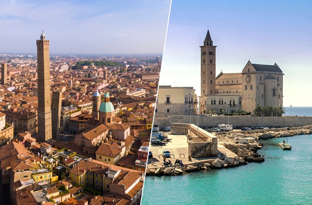 Travelling from Bologna to Trani by train is a fast and economical journey. The Bologna-Trani route is 791 km long and the journey with Italo takes 6 hours and 32 minutes. The price of this trip starts at 33,90, a convenient price to enjoy a round trip to visit beautiful Trani.