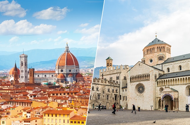 Travelling from Florence to Trento by train is a fast and economical journey. The Florence-Trento route is 297 km long and the journey with Italo takes 2 hours and 39 minutes. The price of this trip starts at 15,90, a convenient price to enjoy a round trip to visit beautiful Trento.