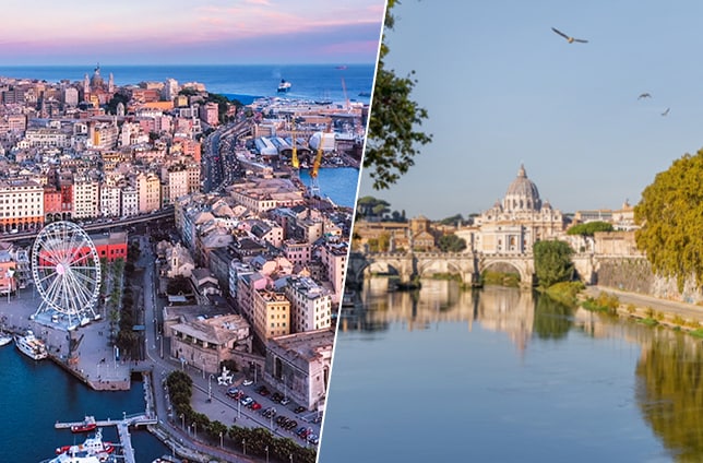 Travelling from Genoa to Rome by train is a fast and economical journey. The Genoa-Rome route is 700 km long and the journey with Italo takes 5 hours and 4 minutes. The price of this trip starts at 25,90, a convenient price to enjoy a round trip to visit beautiful Rome.
