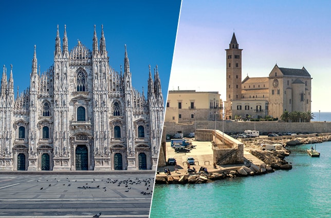 Travelling from Milan to Trani by train is a fast and economical journey. The Milan-Trani route is 1005 km long and the journey with Italo takes 7 hours and 49 minutes. The price of this trip starts at 46,90, a convenient price to enjoy a round trip to visit beautiful Trani.