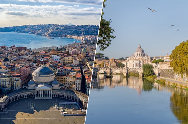 Travelling from Naples to Rome by train is a fast and economical journey. The Naples-Rome route is 222 km long and the journey with Italo takes 55 minutes. The price of this trip starts at 14,90, a convenient price to enjoy a round trip to visit beautiful Rome.