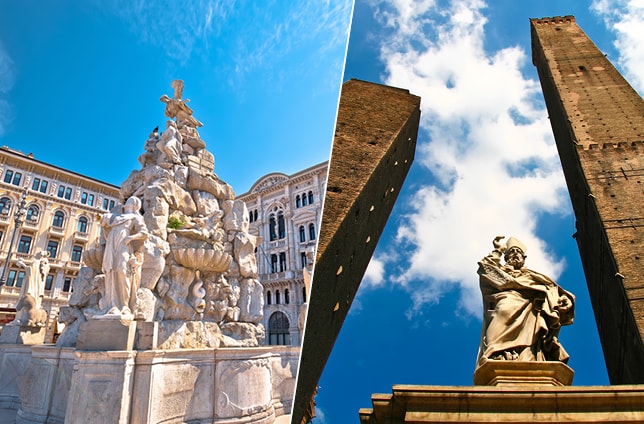 Travelling from Trieste to Bologna by train is a fast and economical journey. The Trieste-Bologna route is 307 km long and the journey with Italo takes 3 hours and 35 minutes. The price of this trip starts at 15,90, a convenient price to enjoy a round trip to visit beautiful Bologna.