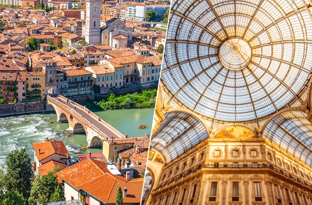 Travelling from Verona to Milan by train is a fast and economical journey. The Verona-Milan route is 149 km long and the journey with Italo takes 1 hour and 12 minutes. The price of this trip starts at 8,90, a convenient price to enjoy a round trip to visit beautiful Milan.