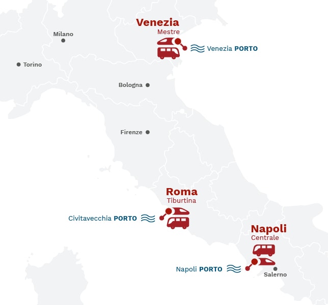Grazie alle connessioni con le stazioni Alta Velocità di Napoli Centrale, Venezia Mestre e Roma Tiburtina, puoi raggiungere i porti di Napoli, Venezia e Civitavecchia