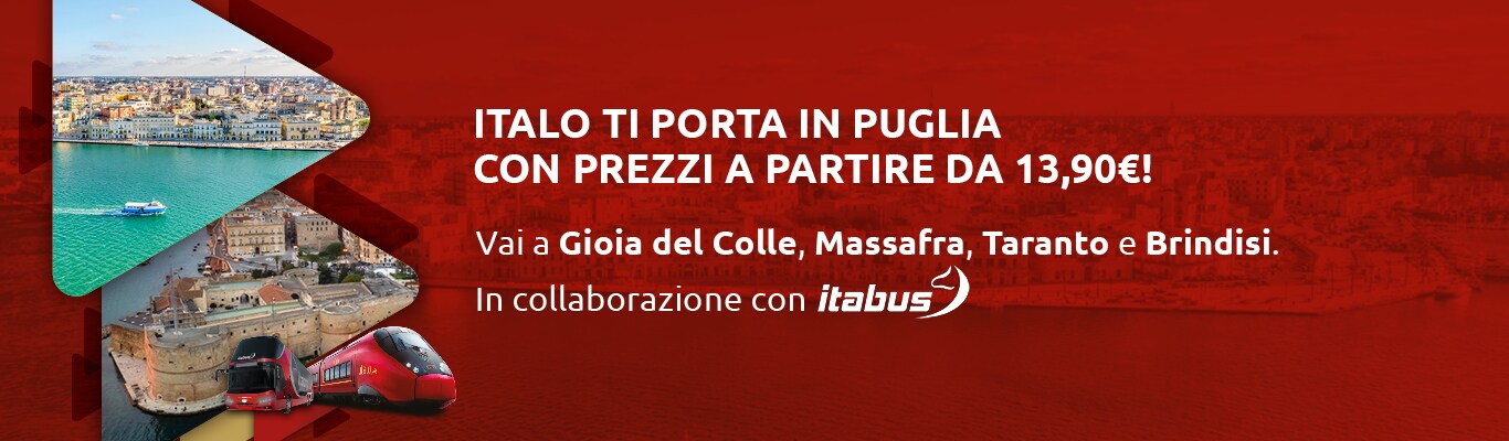 Da oggi, grazie alle connessioni di Italo con Itabus, puoi raggiungere anche Gioia del Colle, Massafra, Taranto e Brindisi.