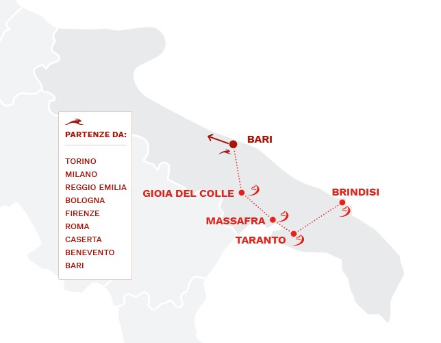 Partenze da Torino, Milano, Reggio Emilia, Bologna, Firenze, Roma, Caserta, Benevento, Bari.